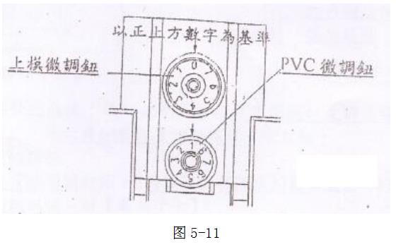 1.上模微調(diào)鈕向外拉出,左右旋轉(zhuǎn)可調(diào)整端子PVC與銅絲的壓著高度(每調(diào)整一格約0.1mm),數(shù)字越大深度越深,數(shù)字越小深度越淺,如圖5-11。